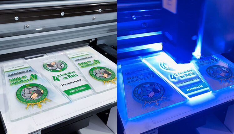 Impressão de imagens em diferentes superfícies e materiais utilizando tinta UV e cura por luz UV. Sendo tambem possível imprimir em película e depois transferir para um objeto através de adesivo.